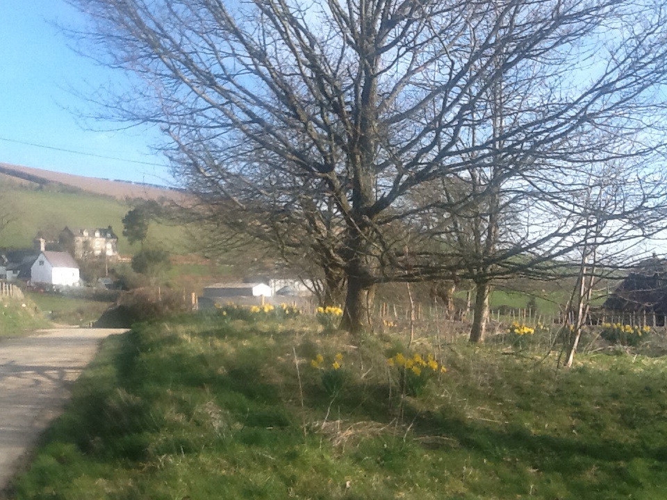 We left the moor and went through Exeter, probably much easier as it was a Sunday. We stopped for lunch soon after (where we discovered we had two sandwiches each!) then began a relaxing and really lovely ride through quiet lanes of Devon. Beautiful daffodils on the banks of the roads, grape hyacinths, wild primrose. And just rolling hills. The kind of cycling you might actually want to do on a Sunday afternoon.